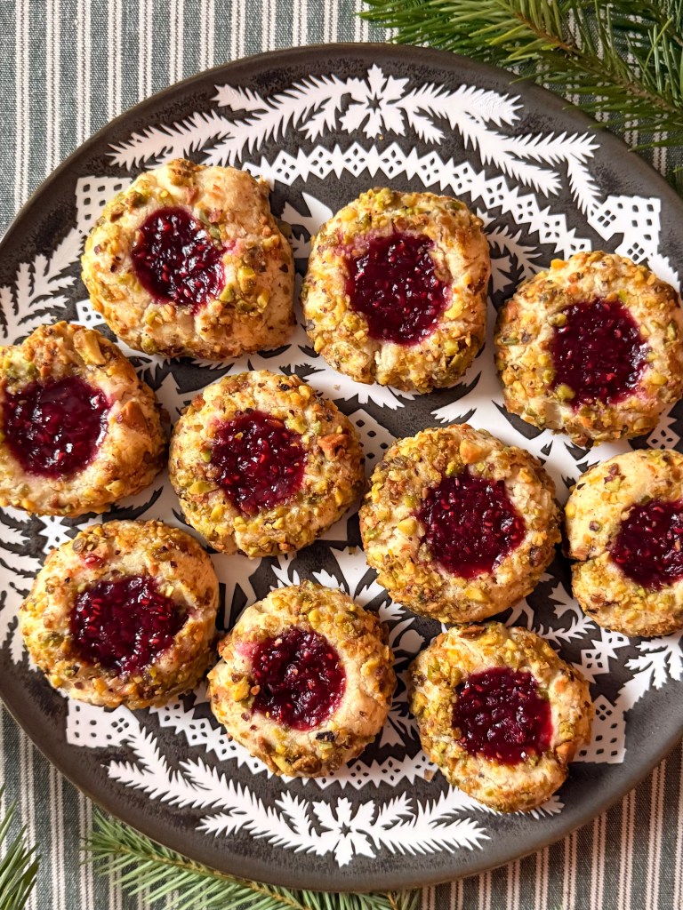 Cardamom-spiced cookies bejeweled with raspberry jam and pistachios